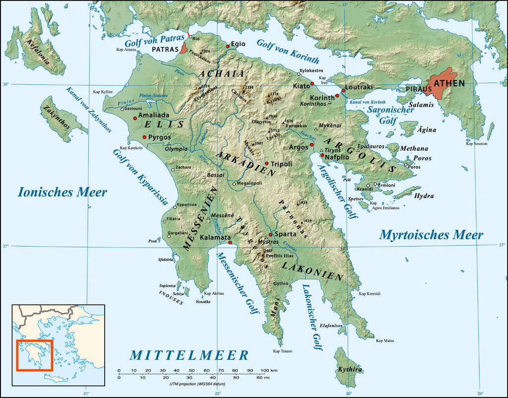 „Die Peloponnes ist der südlichste Teil der Balkanhalbinsel und somit das am weitesten ins Mittelmeer hineinragende Gebiet. Der südlichste Punkt der Peloponnes ist Kap Tenaro. Im Osten wird die Halbinsel von der Ägäis und im Westen vom Ionischen Meer begrenzt.